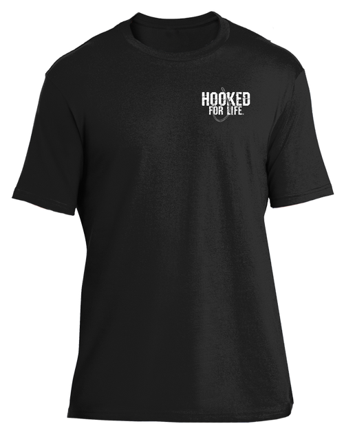 This super soft tee is decorated with a Hooked for Life logo on the left chest and a full color hand painted Shark on the back.